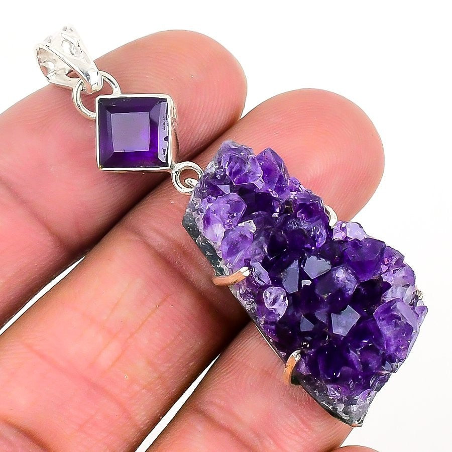 Amethyst Druzy Gemstone 925 Solid Silver Handcrafted Wife Unique Pendant Jewelry