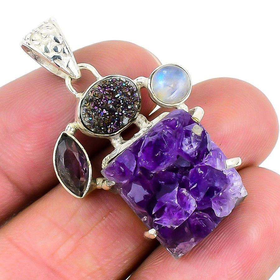 Amethyst Druzy Stone Artisan New Channel Set Pendant Jewelry 925 Solid Silver