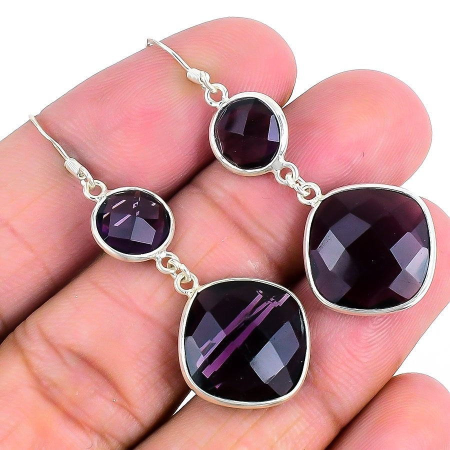 Amethyst Treated Stone Solid Sterling Silver Dangle Drop Hook Earrings Jewelry