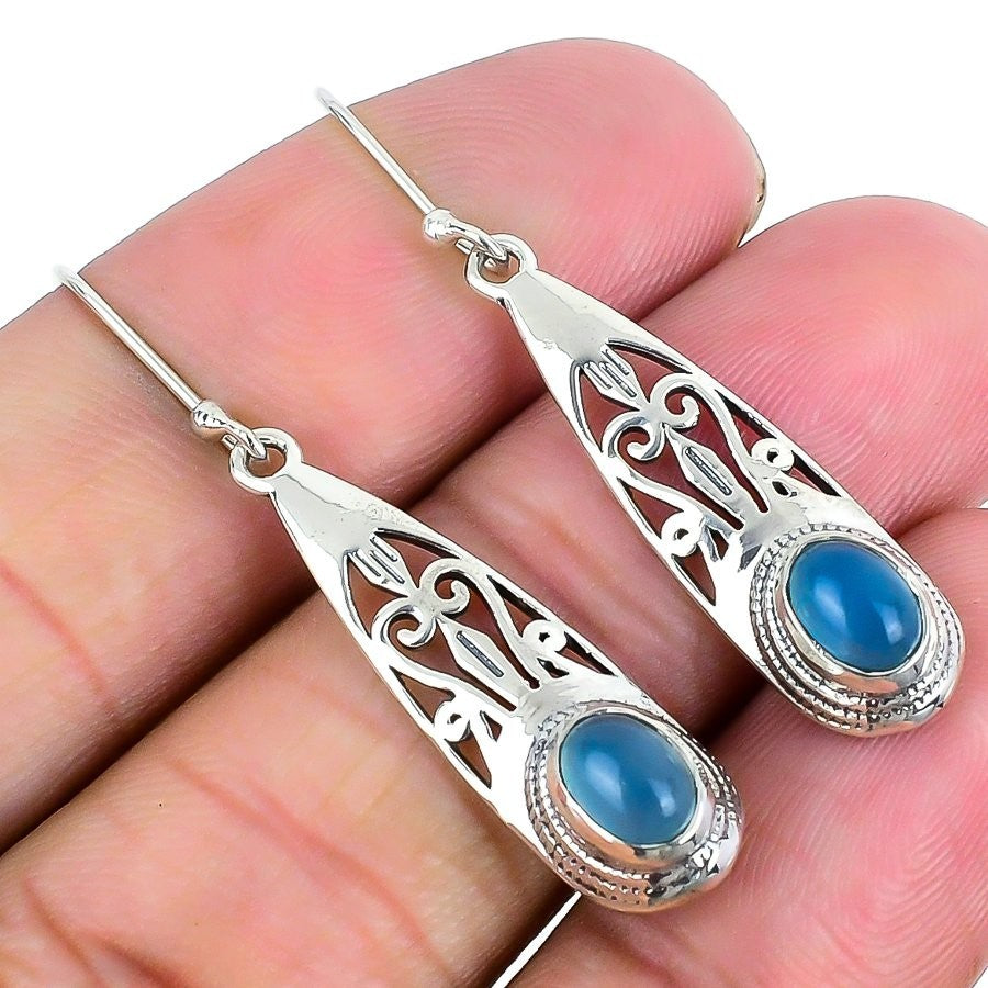 Aqua Chalcedony Gemstone 925 Silver Drop Dangle Elegant Hook Boho Wife Earrings