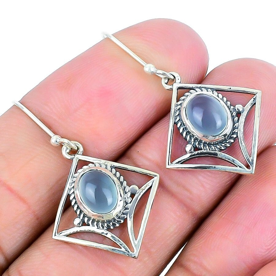 Aqua Chalcedony Gemstone Sterling Silver Sister Boho Dangle Drop Hook Earrings