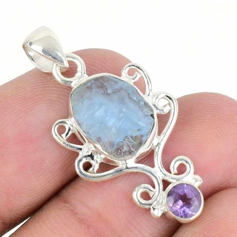 Aquamarine Druzy & amethyst Stone Solid Sterling Silver Birthday Pendant Jewelry