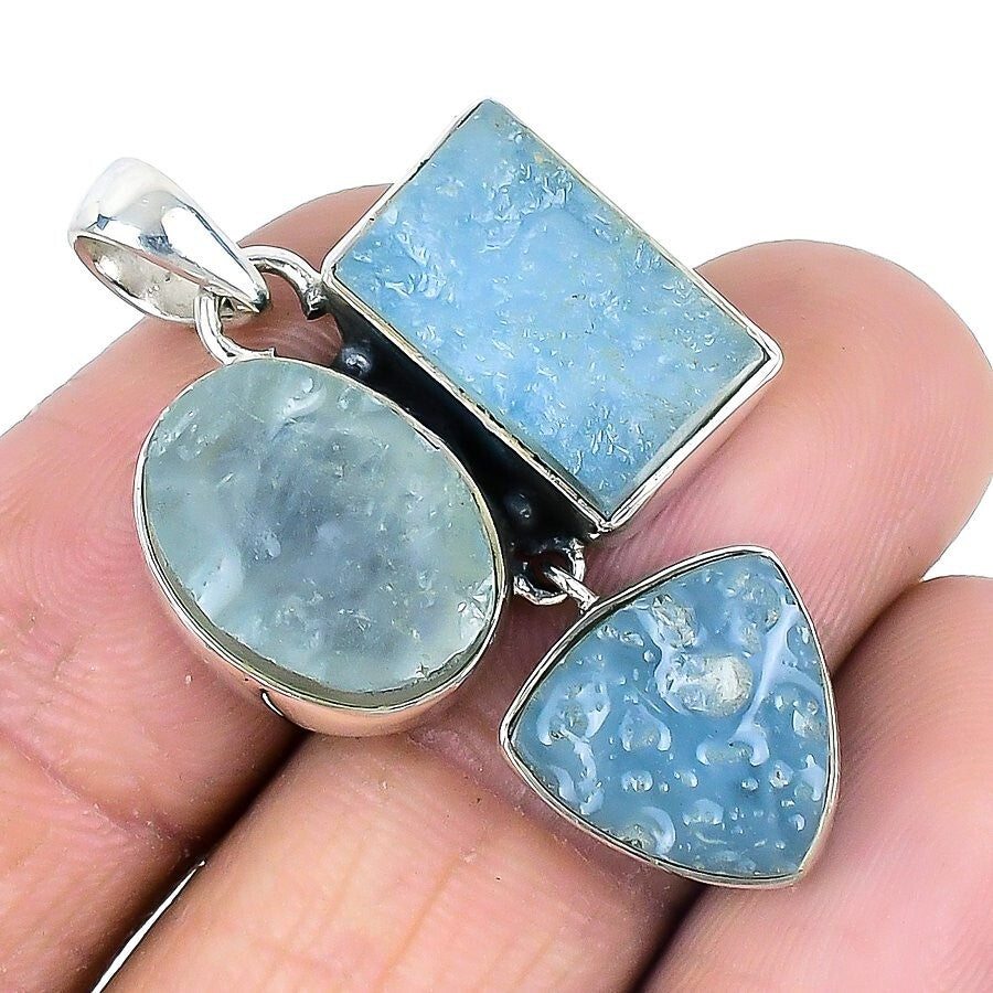 Aquamarine Druzy Stone 925 Solid Silver Ethnic Art Deco Wedding Pendant Jewelry