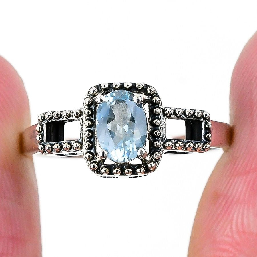Aquamarine Gemstone Boho Cluster Birthday March Ring Jewelry 925 Sterling Silver