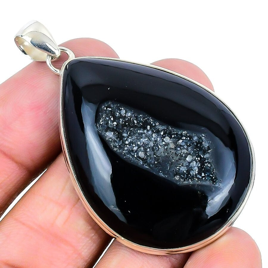 Black Botswana Druzy Stone 925 Sterling Silver Engagement Sister Wedding Pendant