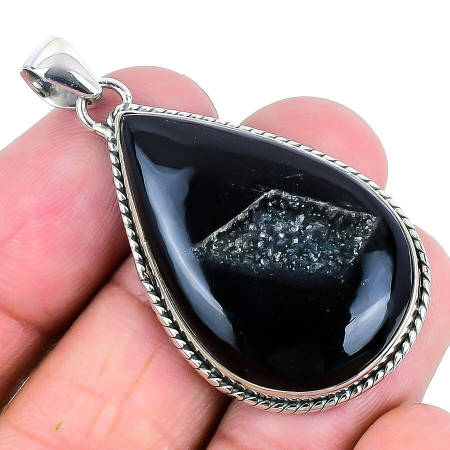 Black Botswana Druzy Stone Mothers Gift Trendy Wedding Pendant Sterling Silver