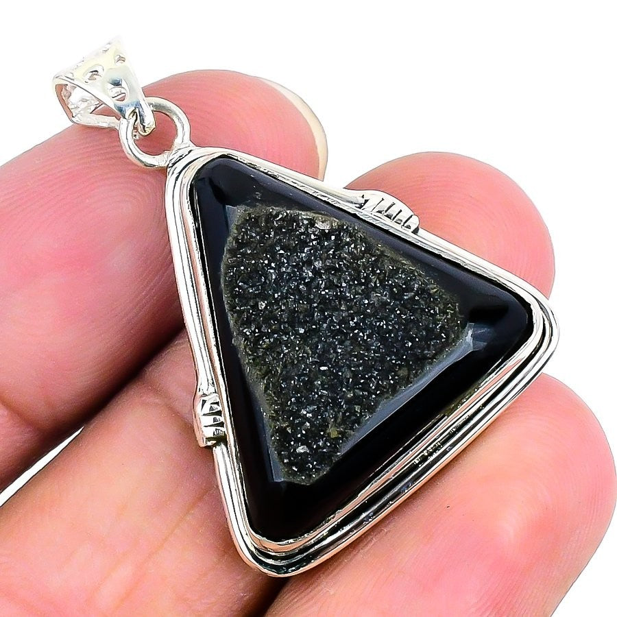 Black Druzy Stone 925 Solid Silver Bezel Unique Birthday Elegant Pendant Jewelry