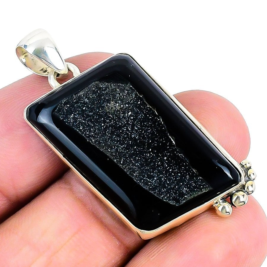 Black Druzy Stone 925 Sterling Silver Sister Bezel Daughters Day Pendant Jewelry
