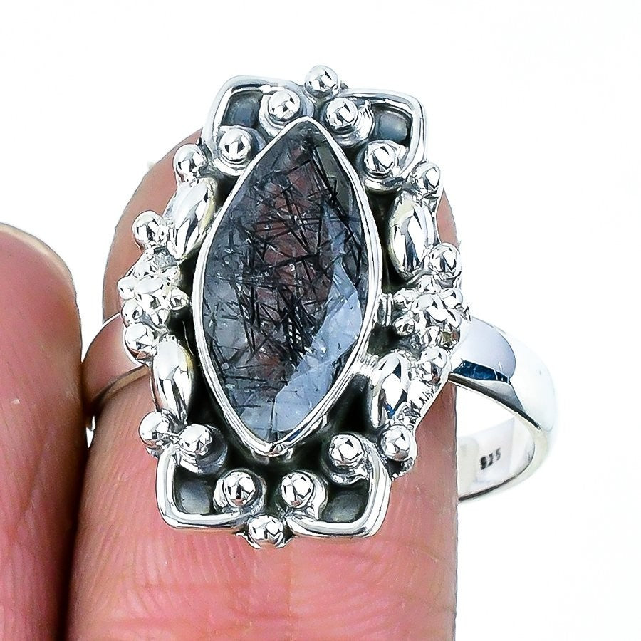 Black Rutile Faceted Stone Solid Silver Statement Unique Ring Jewelry Size 10