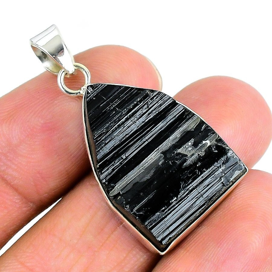 Black Tourmaline Gemstone Solid Silver Artisan Bezel Wedding Boho Sister Pendant