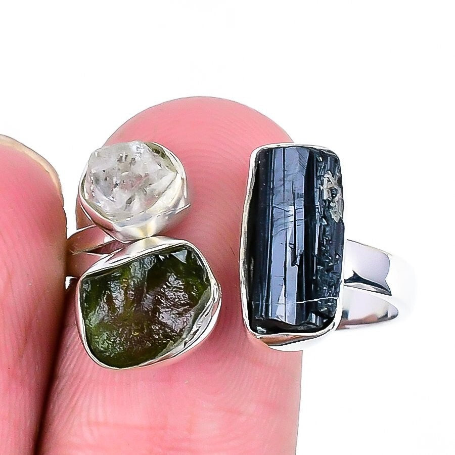 Black Tourmaline Stone 925 Solid Silver Birthday Cluster Ring Jewelry Size 12.5