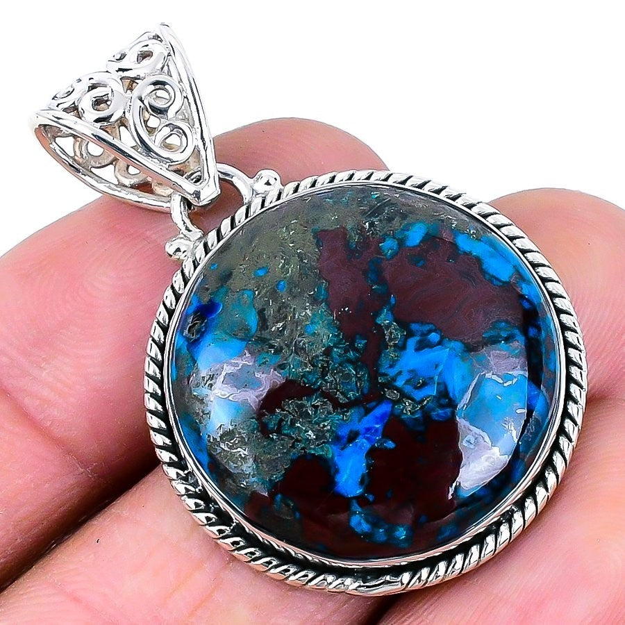 Blue Azurite Stone 925 Silver Mother Third Eye Chakra Ethnic Art Deco Pendant