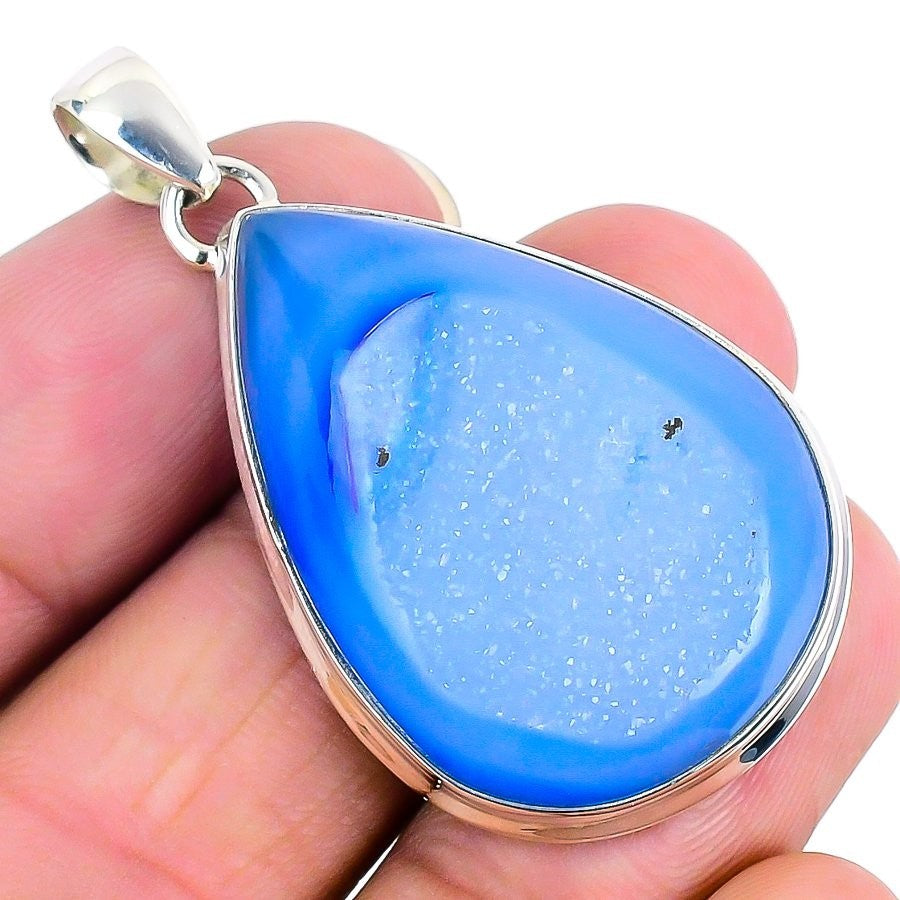 Blue Druzy Gemstone 925 Solid Silver Bezel Sister Birthday Boho Pendant Jewelry