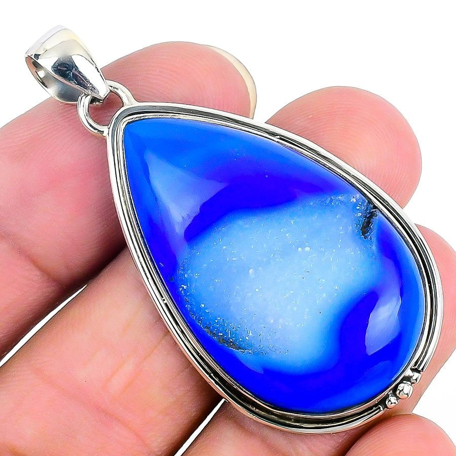 Blue Druzy Gemstone Solid Silver Handmade Bezel Art Deco Sister Pendant Jewelry