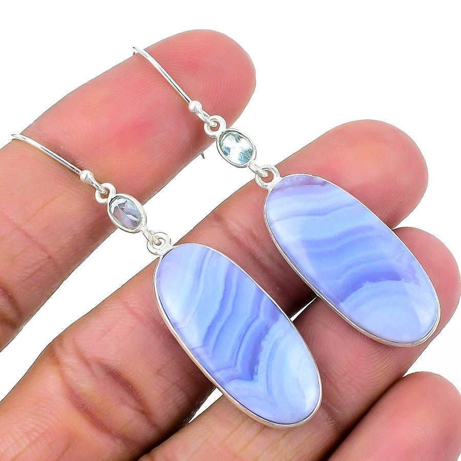 Blue Lace Agate Gemstone 925 Sterling Silver Trendy Drop Mother Earrings Jewelry