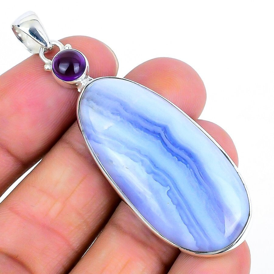 Blue Lace Agate Stone 925 Silver Channel Set Mother Birthday New Pendant Jewelry