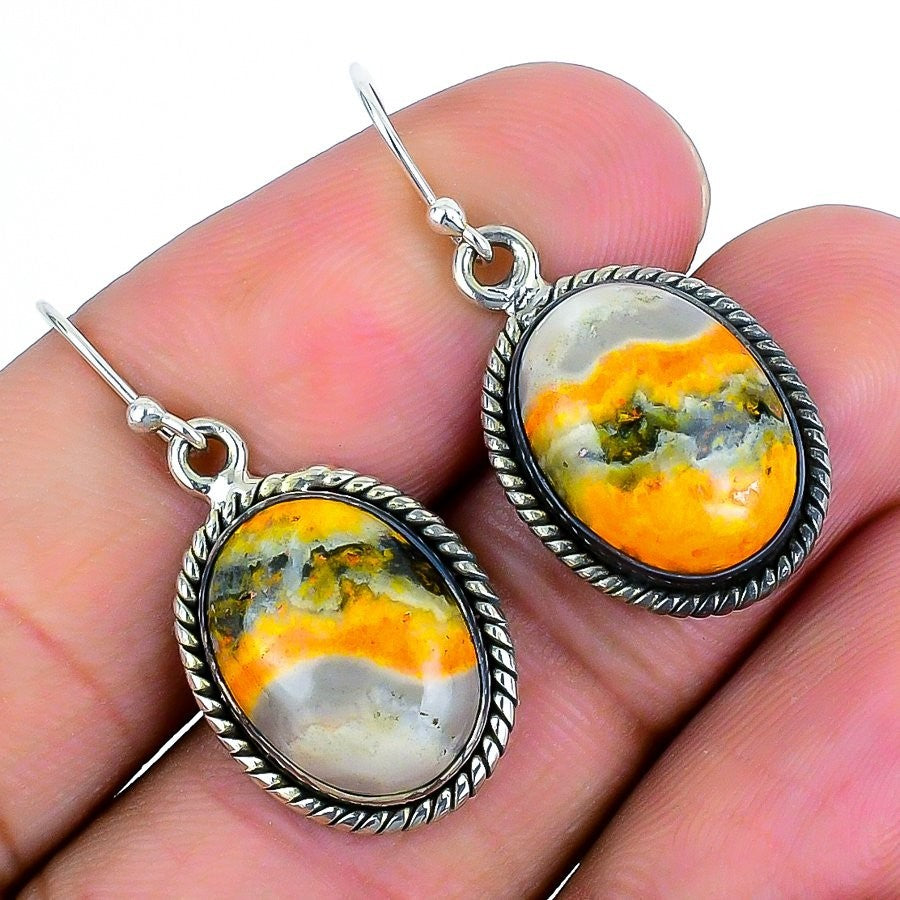Bumblebee Jasper Gemstone 925 Solid Silver Dangle Drop Channel Set Boho Earrings