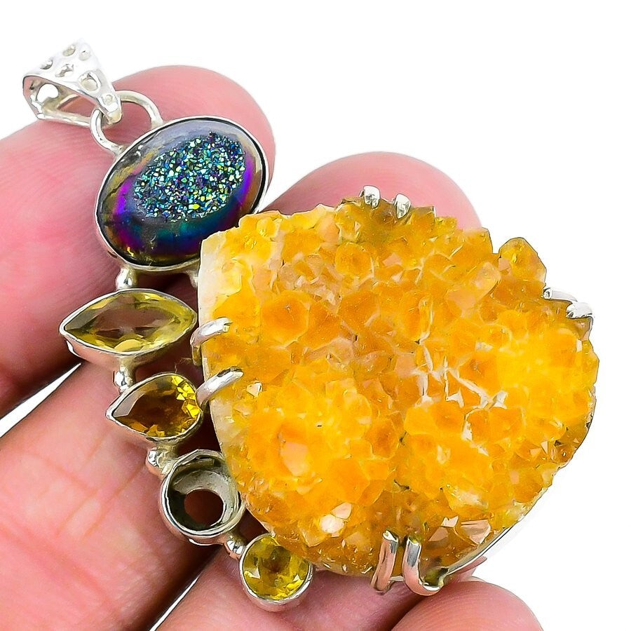 Citrine Druzy Stone Mothers day Wife Trendy Anniversary Boho Pendant 925 Silver