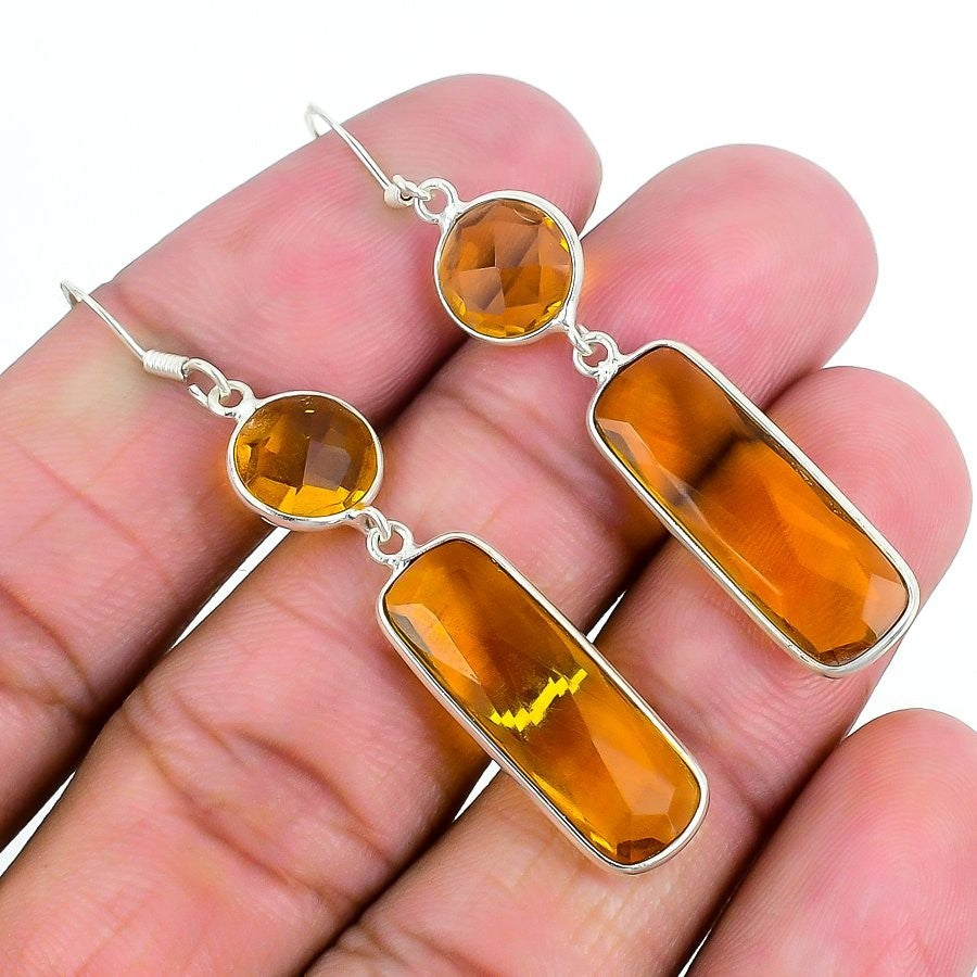 Citrine Treated Gemstone 925 Solid Silver Trendy Dangle Hook Earrings Jewelry