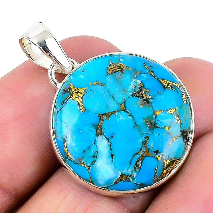 Copper Blue Turquoise Stone 925 Solid Silver Sister Engagement Art Deco Pendant