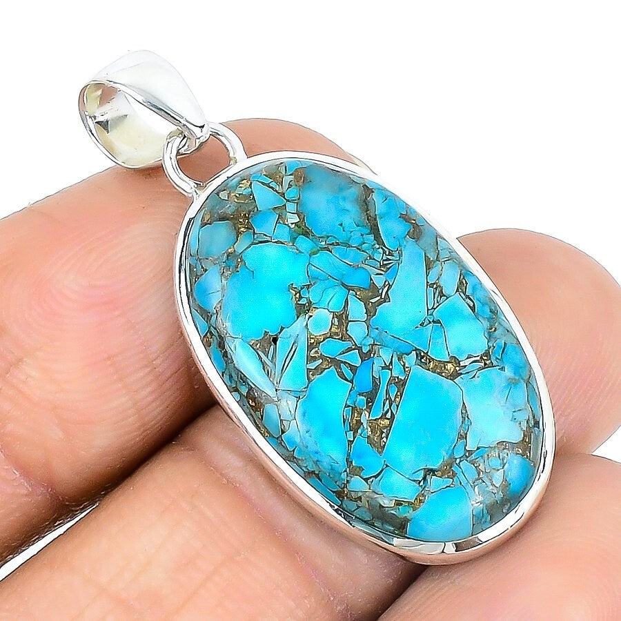 Copper Blue Turquoise Stone Mother Artisan December Unique Pendant 925 Silver
