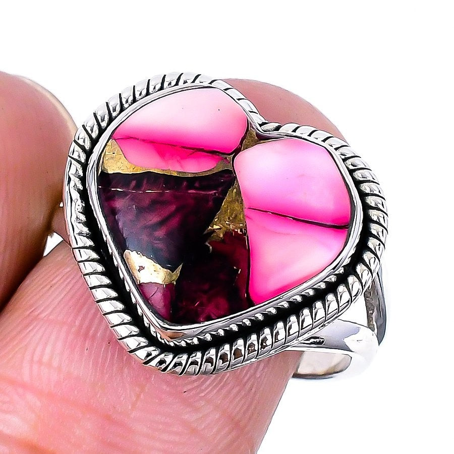 Copper Pink Turquoise heart Gemstone Solid Sterling Silver Statement Ring Size 9