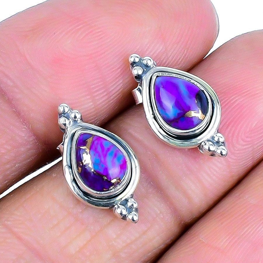 Copper Purple Turquoise Gemstone Stud Post Elegant Earrings Jewelry Solid Silver