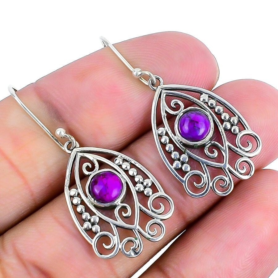 Copper Purple Turquoise Stone Sterling Silver Bezel Dangle Drop Elegant Earrings