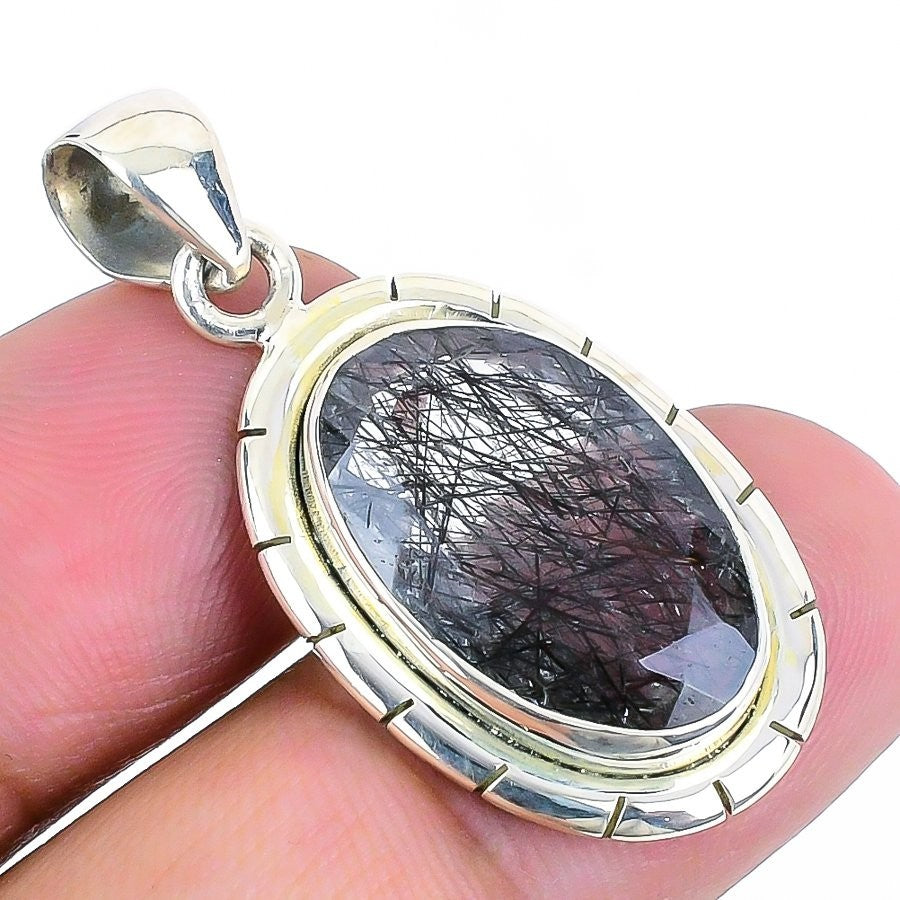 Daughters Day Deal Natural Black Rutile Faceted Solid Silver New Wedding Pendant