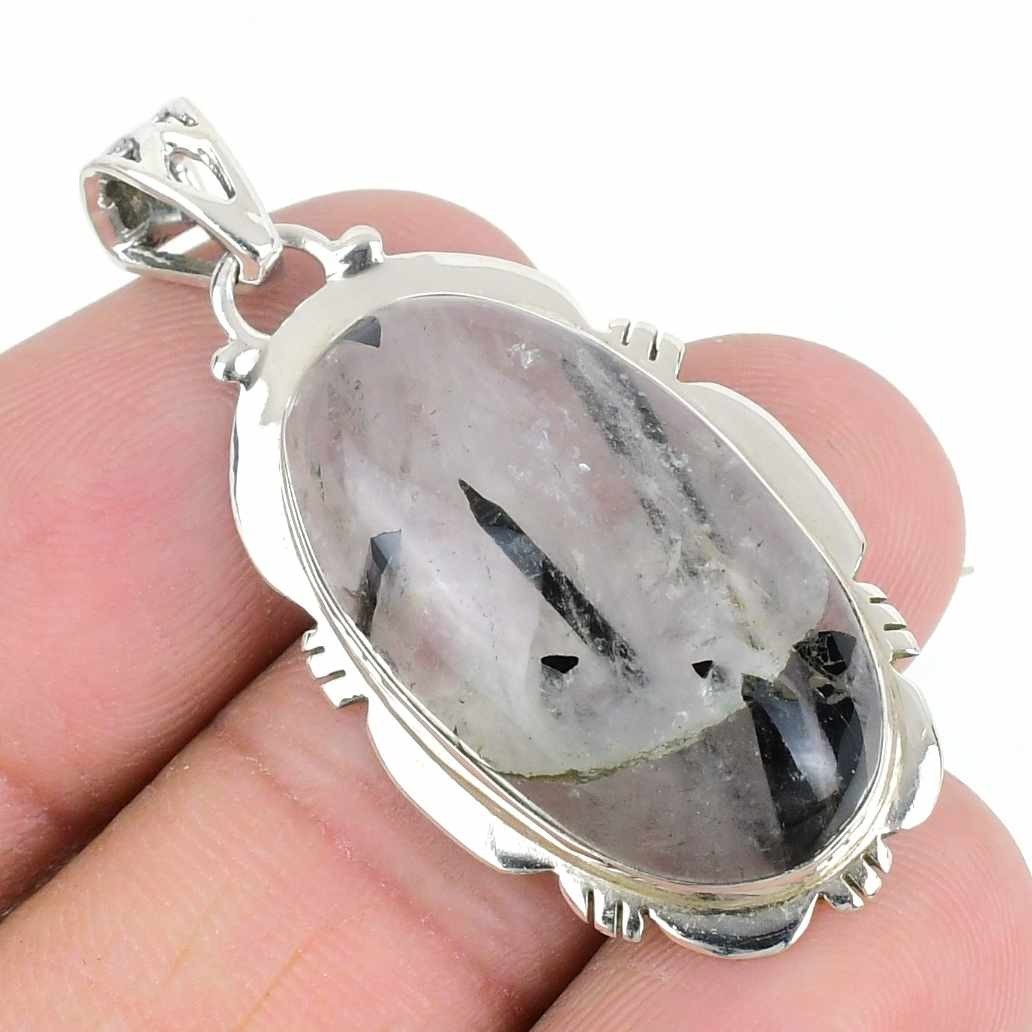 Daughters Day Sale Black Rutile Stone Solid Sterling Silver Birthday New Pendant