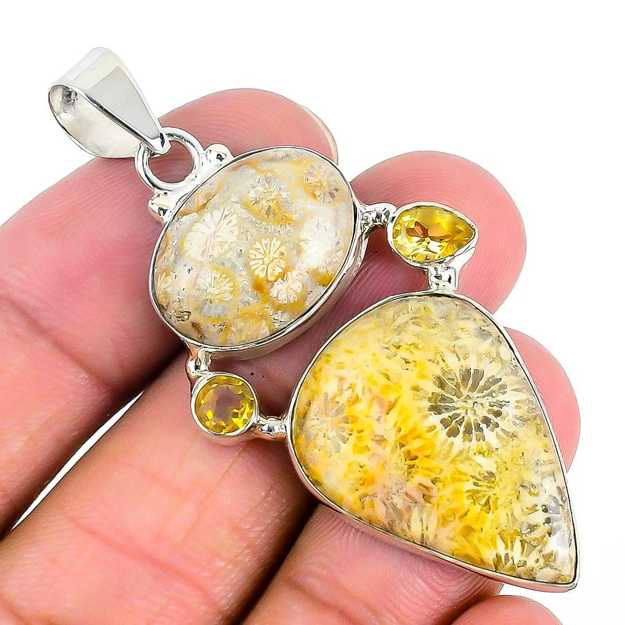 Daughters Day Sale Fossil Coral Gemstone Solid Sterling Silver Bezel New Pendant