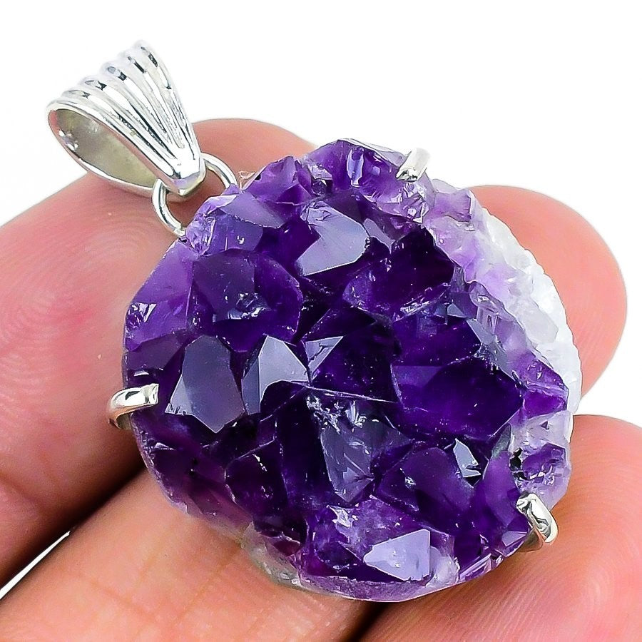 Daughters Day Sale Natural Amethyst Druzy 925 Solid Silver Bezel New Pendant
