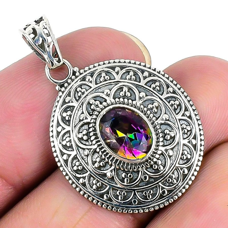 Daughters Day Sale Rainbow Mystic Topaz Stone Sister Bezel Pendant Solid Silver