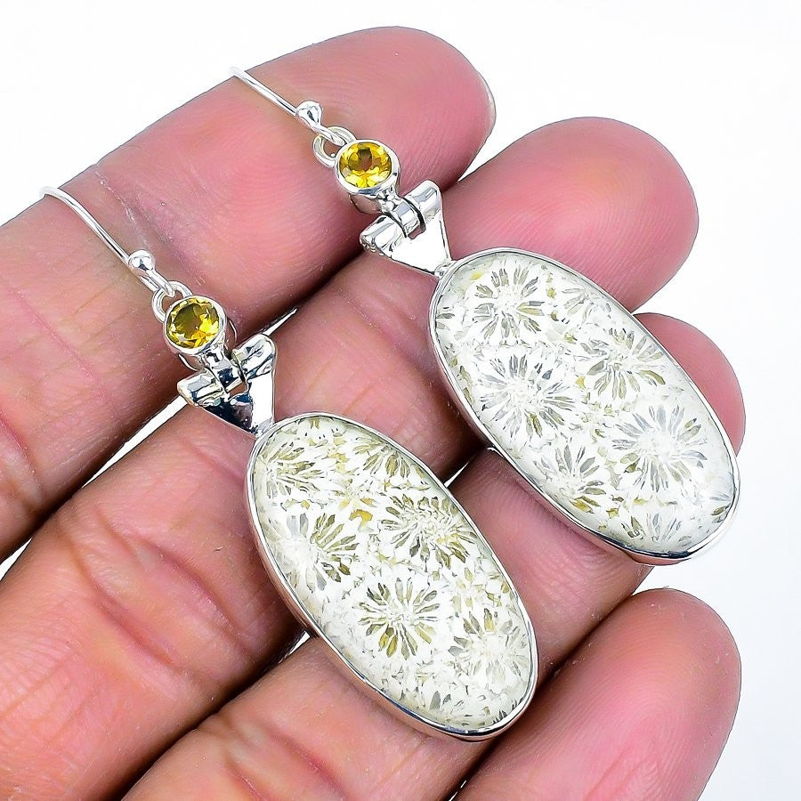 Fossil Coral Stone 925 Silver Boho Dangle Drop Root Chakra Anniversary Earrings