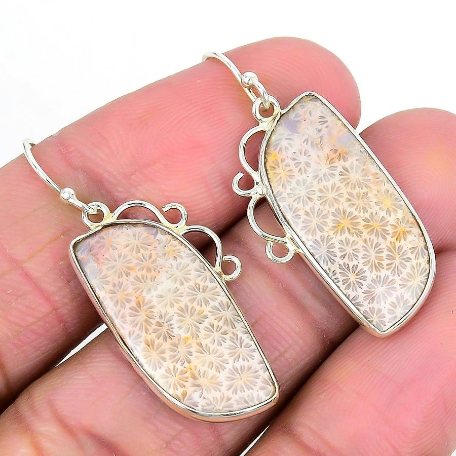 Elegant Fossil"Coral Stone Sterling Silver Wedding Dangle Be