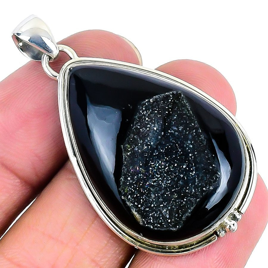 Friendship Day Deal Black Druzy Gemstone Solid Silver Wife Bezel Pendant Jewelry