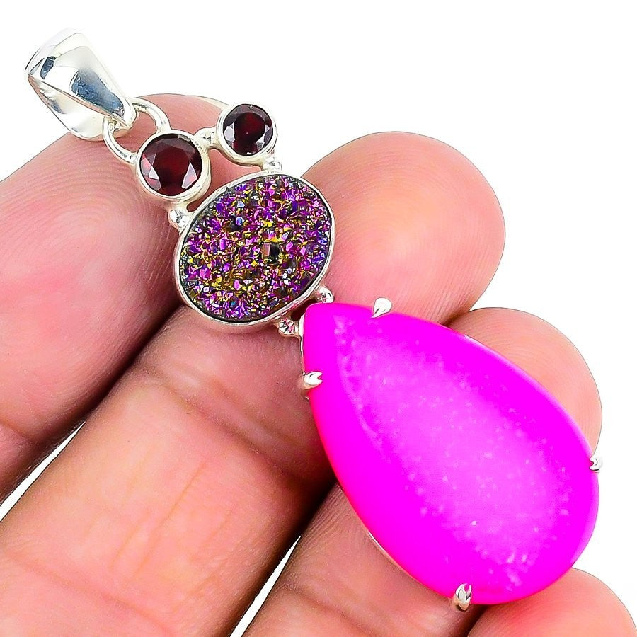 Friendship Day Sale Pink Druzy Gemstone 925 Silver Wedding Bezel Pendant Jewelry