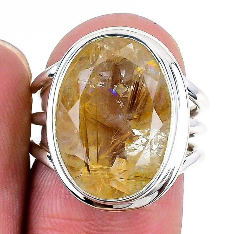 Golden Rutile Faceted Gemstone Solid Silver Unique Statement Ring Jewelry US 6.5