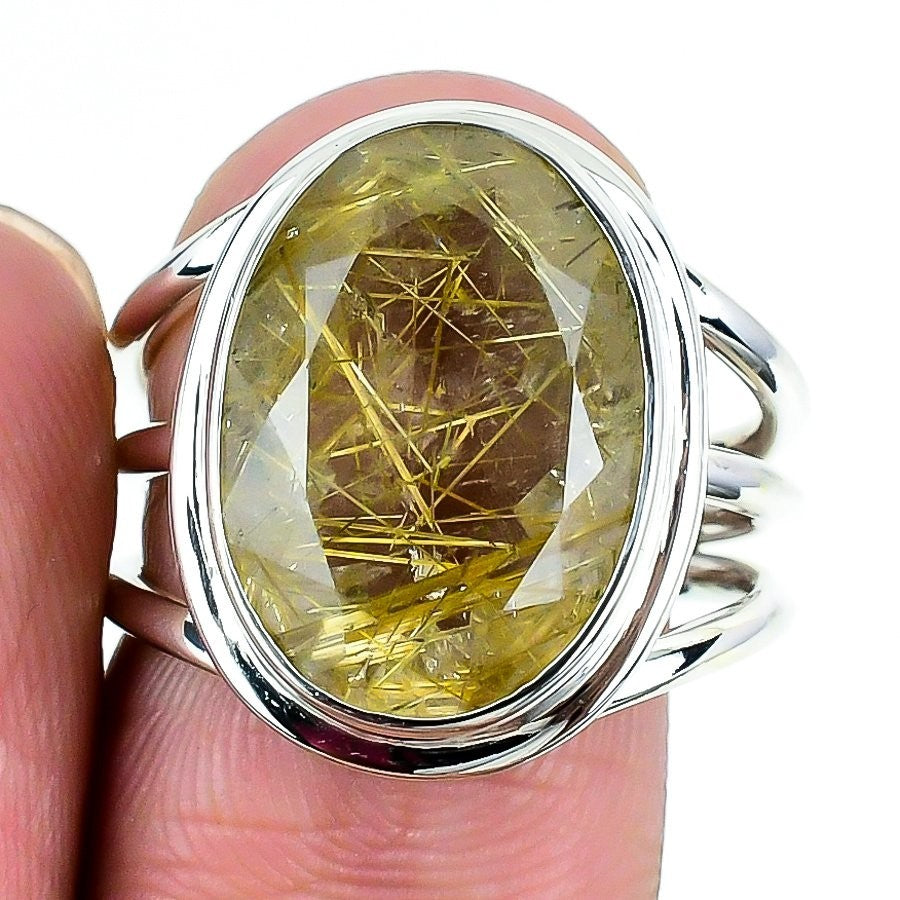 Golden Rutile Faceted Stone Solid Sterling Silver Statement Ring Jewelry US 8.5