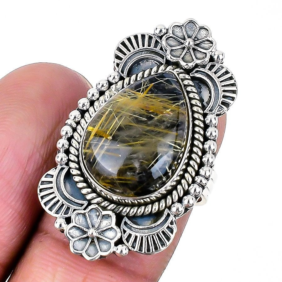 Golden Rutile onyx backed Stone Solid Sterling Silver Statement New Ring US 6.5