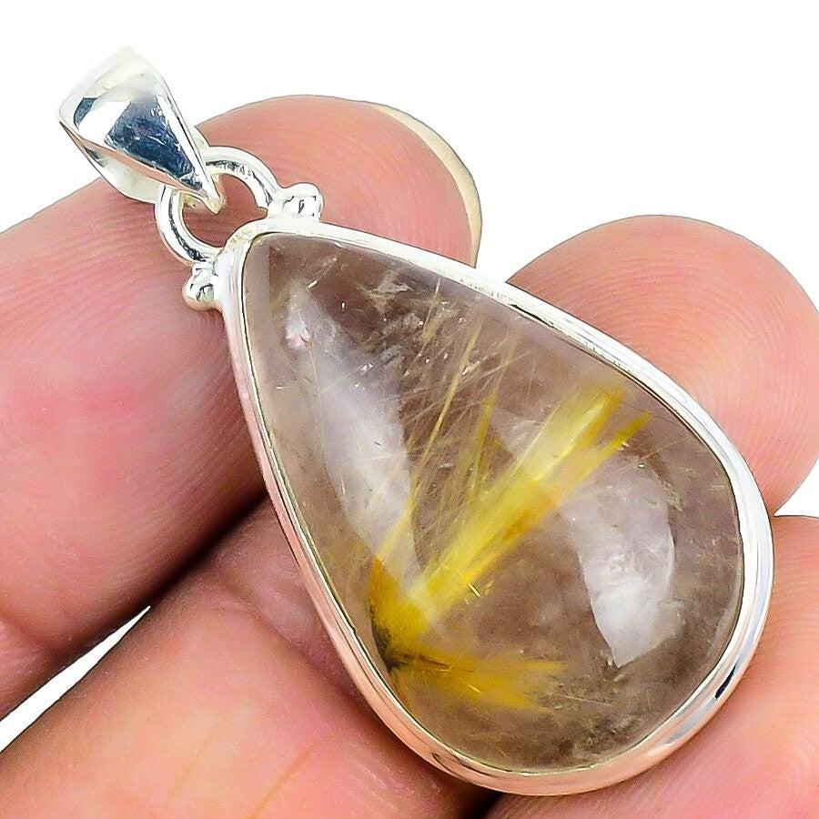 Golden Rutile Stone 925 Solid Silver Wedding Bezel Wife Birthday Pendant Jewelry