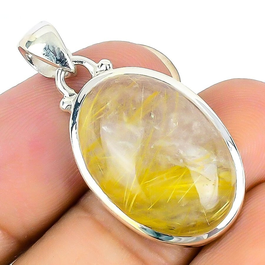 Golden Rutile Stone Solid Silver Bezel Birthday Engagement Boho Pendant Jewelry