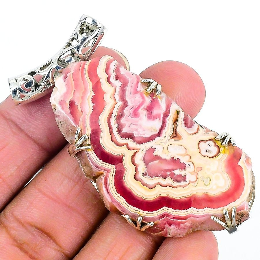Heart Chakra Natural Rhodochrosite Bezel Trendy Boho Pendant 925 Sterling Silver
