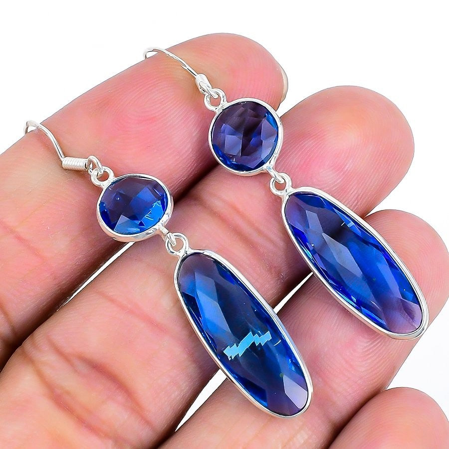 Iolite Treated Glass Stone 925 Solid Silver Dangling Wedding Hook Bezel Earrings