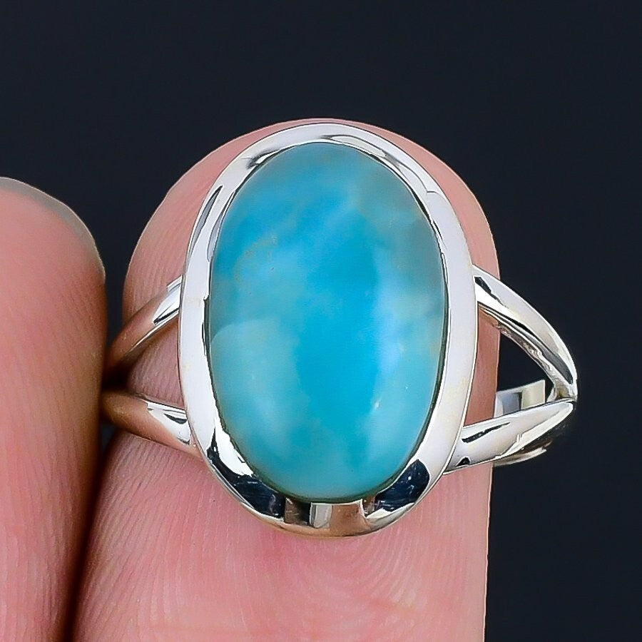Larimar Stone 925 Sterling Silver Elegant Wedding Statement Bezel Ring Size 8.5