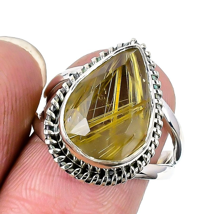 Memorial Day Sale Natural Golden Rutile 925 Silver Statement Wife Ring Jewelry