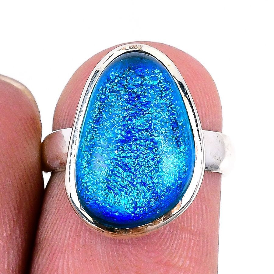 Mexican Dico Glass Gemstone Solid Sterling Silver Trendy Statement Ring Size 5.5