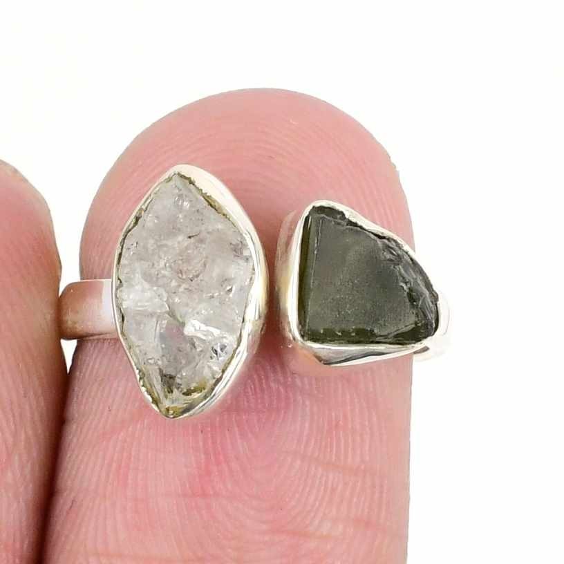 Moldavite Herkimer Diamond Gemstone Solid Silver New Cluster Ring Jewelry Size 7