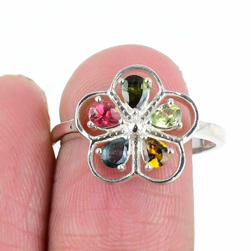 Multi Tourmaline Gemstone 925 Solid Silver Artisan Birthday Cluster Ring Jewelry