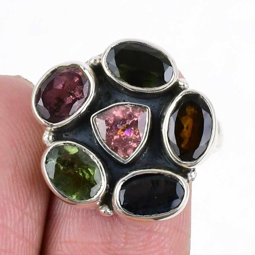 Multi Tourmaline Stone Solid Sterling Silver Cluster Artisan Ring Jewelry Size 8